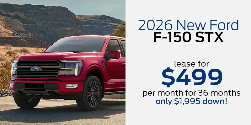 $499/month lease on a new 2026 Ford F-150 STX for 36 months with $1,995 down, excludes tax, tag, title, registration fees and first month's payment. 10,500 miles per year with overage charges of $0.25/mile over 31,500 miles. With approved credit through Ford Financial. Other restrictions may apply, see dealer for details. Option to purchase at lease end for an amount to be determined at lease signing. Lessor must approve lease. Lessee pays for maintenance, repair, excess wear and disposition fee of $695 or less at end of lease. Based on Stock #F26036 with an MSRP of $51,370. See dealer for all details.